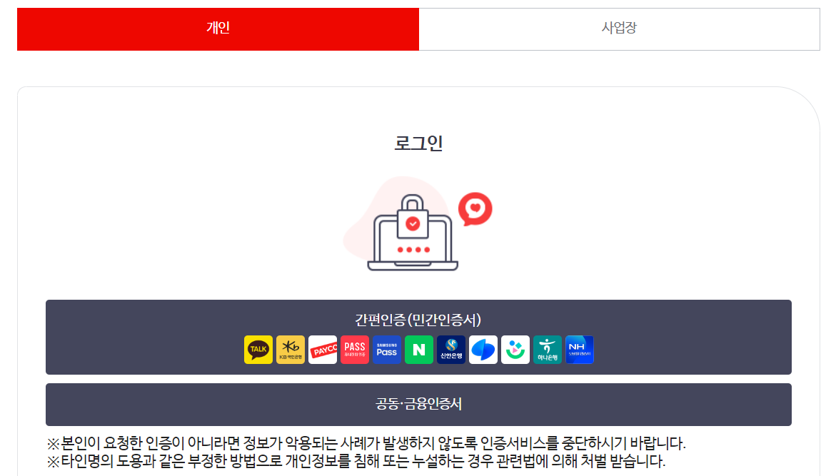 3️⃣ 로그인 화면이 뜨면 간편인증 또는 공동, 금융인증서를 통해 로그인합니다.