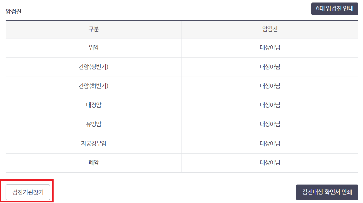 * 아래 사진에 '검진기관 찾기' (빨간박스 표시)를 클릭하시면 지역 설정에 따라 내 주변이나 검진 받을 지역에 건강검진센터를 찾아볼 수 있으며 자세한 정보도 확인 가능합니다.