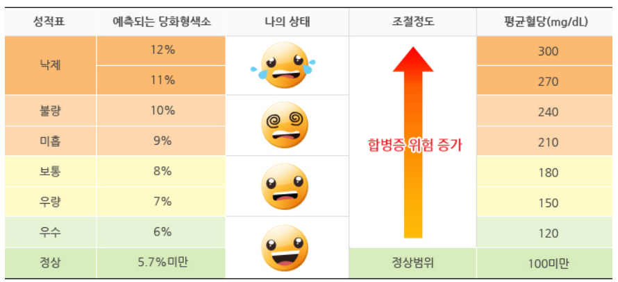 - HbA1C (당화혈색소) : 혈당이 높아지면 포도당의 일부가 혈색소에 결합하게 되고 이것을 당화혈색소라고 합니다. 혈당이 높을수록 당화혈색소는 점점 높아집니다. 일반적인 혈당검사는 매일의 혈당 상태를 알 수 있으며, 당화혈색소는 과거 6주 ~ 10주 동안의 평균 혈당 조절상태를 반영합니다.