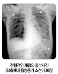 [ 폐렴 환자의 X-ray 사진으로 좌측폐(오른쪽)에 하얗게 보이는 부분이 염증반응이 일어난 부분]